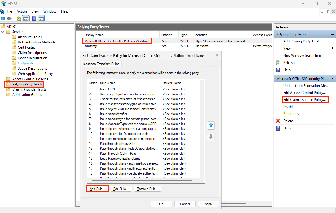 If we have the base ADFS settings, thsn we need to edit the Relying Party Trust and edit the Microsoft Office 365 Identity Platform Worldwide. In the Edit Claim Issuance Policy we need to add a new rule, which will forward the MFA claim.