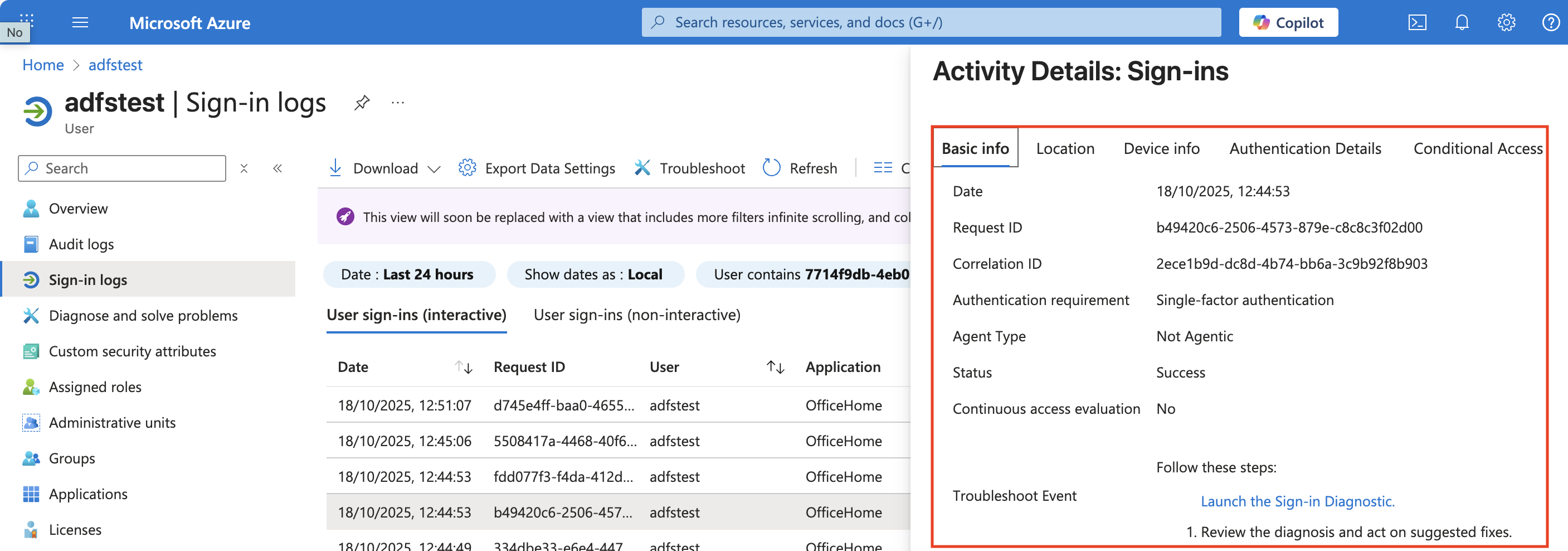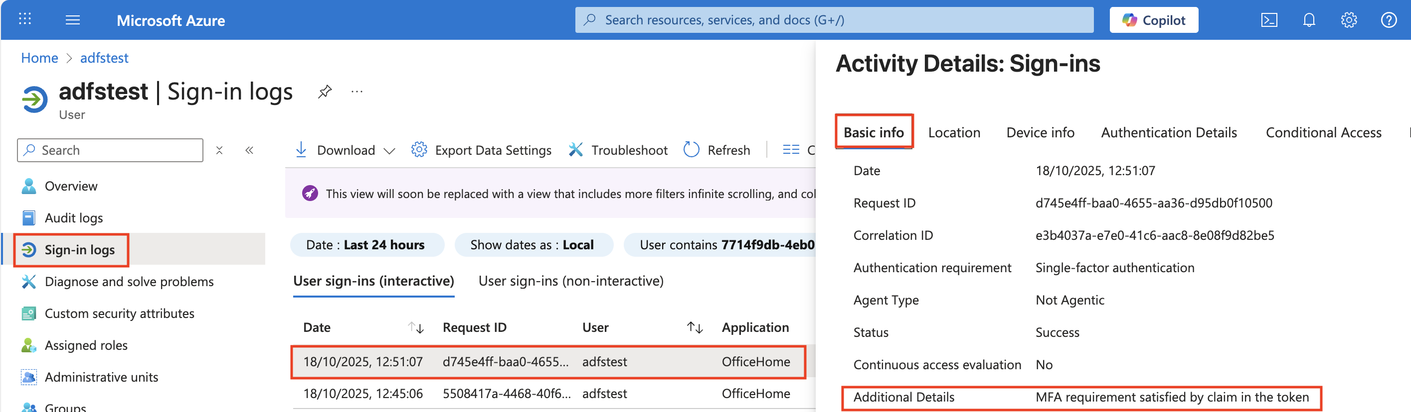 As you can see, the Authentication Details show that the user has authenticated using Multi-Factor Authentication (MFA). This indicates that the MFA claim has been successfully forwarded from ADFS to EntraID.